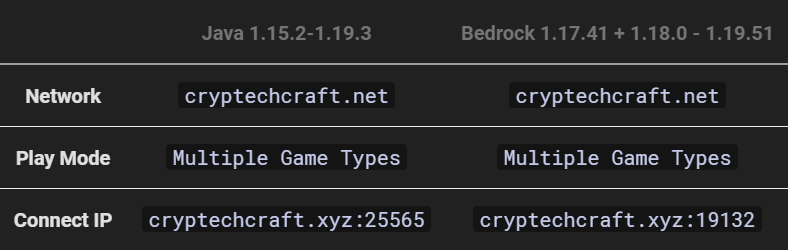 CryptechCraft is a multi-server Minecraft network with multiple game types and real cryptocurrency as in game currency. CrystalCrypts, CryptoCredits, Guns, ObsidianDestroyer and more custom plugins as well.